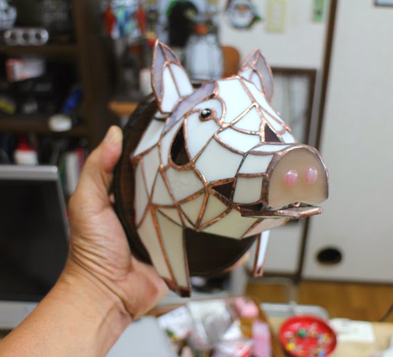ブタの半分です、 前に作ったお尻と並べて飾ってみます。 |
